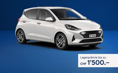 Lagerprämie (Beispiel): i10 Origo 1.0 46.3 kW / 63 PS 5 MT, Energieverbrauch (Fahrbetrieb): 5.5 l/100 km, CO₂-Emissionen (Fahrbetrieb): 126 g/km, CO₂-Emissionen (Fahrbetrieb) aus der Treibstoff- und/oder Strombereitstellung: 25 g/km, Energieeffizienz-Kategorie: D. Barzahlungspreis: CHF 17'400.–, Listenpreis: CHF 18'900.– (Lagerprämie: CHF 1'500.–). Die Summe (Wert) des Rabatts (Lagerprämie) ist modell- und fahrzeugabhängig. Aktion gültig vom 07.02.2026 bis 28.02.2026 und nur solange Vorrat. Die genannten Angebote gelten nur für Privatkunden und nur bei teilnehmenden Händlern. Alle Beträge inkl. MwSt. Unverbindliche Preisempfehlungen, Preisänderungen vorbehalten.