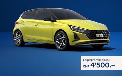 Lagerprämie (Beispiel): i20 Origo 1.0 T-GDI 66 kW / 90 PS 6 MT, Energieverbrauch (Fahrbetrieb): 5.6 l/100 km, CO₂-Emissionen (Fahrbetrieb): 127 g/km, CO₂-Emissionen (Fahrbetrieb) aus der Treibstoff- und/oder Strombereitstellung: 26 g/km, Energieeffizienz-Kategorie: D. Barzahlungspreis: CHF 19'300.–, Listenpreis: CHF 23'800.– (Lagerprämie: CHF 4'500.–). Die Summe (Wert) des Rabatts (Lagerprämie) ist modell- und fahrzeugabhängig. Aktion gültig vom 07.02.2026 bis 28.02.2026 und nur solange Vorrat. Die genannten Angebote gelten nur für Privatkunden und nur bei teilnehmenden Händlern. Alle Beträge inkl. MwSt. Unverbindliche Preisempfehlungen, Preisänderungen vorbehalten.