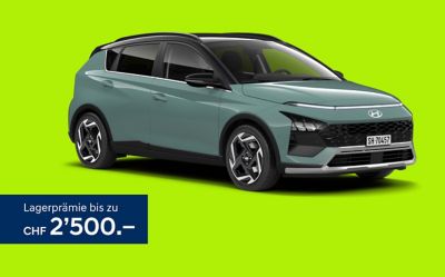 Lagerprämie (Beispiel): BAYON Origo 1.0 T-GDi 66 kW / 90 PS 7 DCT, Energieverbrauch (Fahrbetrieb): 6.4 l/100 km, CO₂-Emissionen (Fahrbetrieb): 128 g/km, CO₂-Emissionen (Fahrbetrieb) aus der Treibstoff- und/oder Strombereitstellung: 30 g/km, Energieeffizienz-Kategorie: E. Barzahlungspreis: CHF 24'500.–, Listenpreis: CHF 27'000.– (Lagerprämie: CHF 2'500.–). Die Summe (Wert) des Rabatts (Lagerprämie) ist modell- und fahrzeugabhängig. Aktion gültig vom 01.04.2026 bis 30.06.2026 und nur solange Vorrat. Die genannten Angebote gelten nur für Privatkunden und nur bei teilnehmenden Händlern. Alle Beträge inkl. MwSt. Unverbindliche Preisempfehlungen, Preisänderungen vorbehalten.