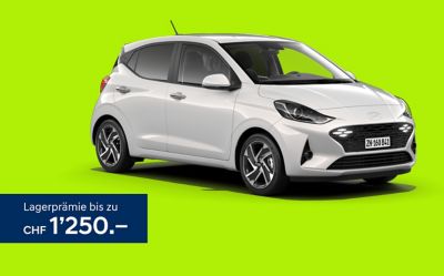 Lagerprämie (Beispiel): i10 Origo 1.0 46.3 kW / 63 PS 5 MT, Energieverbrauch (Fahrbetrieb): 7.6 l/100 km, CO₂-Emissionen (Fahrbetrieb): 126 g/km, CO₂-Emissionen (Fahrbetrieb) aus der Treibstoff- und/oder Strombereitstellung: 35 g/km, Energieeffizienz-Kategorie: G. Barzahlungspreis: CHF 17'650.–, Listenpreis: CHF 18'900.– (Lagerprämie: CHF 1'250.–). Die Summe (Wert) des Rabatts (Lagerprämie) ist modell- und fahrzeugabhängig. Aktion gültig vom 01.04.2026 bis 30.06.2026 und nur solange Vorrat. Die genannten Angebote gelten nur für Privatkunden und nur bei teilnehmenden Händlern. Alle Beträge inkl. MwSt. Unverbindliche Preisempfehlungen, Preisänderungen vorbehalten.