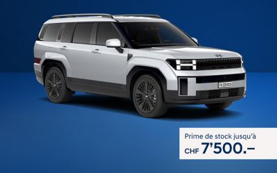 Prime de stock (exemple): SANTA FE MY25 Vertex® 1.6 T-GDi PHEV 186 kW / 253 PS 6 AT 4WD, consommation d’énergie (conduite): 1.7 l/100 km + 19.2 kWh/100 km, équivalent essence (total): 3.8 l/100 km, émissions de CO₂ (conduite): 38 g/km, émissions de CO₂ liées à la production de carburant et/ou d’électricité: 29 g/km, catégorie d’efficacité énergétique: E. Prix catalogue: CHF 72'700.– (Prime de stock: CHF 7'500.–). La valeur totale de l’avantage (Prime de stock) dépend du modèle et du véhicule. Offre valable du 07.02.2026 au 28.02.2026 et jusqu’à épuisement du stock. Offres réservées aux clients privés et aux concessionnaires participants. Tous les montants incluent la TVA. Prix indicatifs non contraignants, sous réserve de modifications.