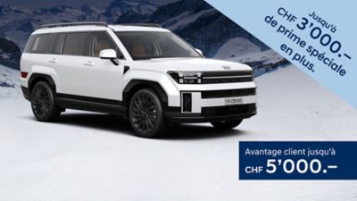 Prime de stock (exemple): SANTA FE MY26 Vertex 1.6 T-GDi PHEV 212 kW / 288 PS 6 AT 4WD, consommation d’énergie (conduite): 3.8 l/100 km + 11.4 kWh/100 km, équivalent essence (total): 5.1 l/100 km, émissions de CO₂ (conduite): 38 g/km, émissions de CO₂ liées à la production de carburant et/ou d’électricité: 30 g/km, catégorie d’efficacité énergétique: E. Prix catalogue: CHF 72'700.– (Prime de stock: CHF 6'500.– + Swiss Edition: CHF 1'770.–). La valeur totale de l’avantage (Prime de stock) dépend du modèle et du véhicule. Offre valable du 07.02.2026 au 31.03.2026 et jusqu’à épuisement du stock. Offres réservées aux clients privés et aux concessionnaires participants. Tous les montants incluent la TVA. Prix indicatifs non contraignants, sous réserve de modifications. L’offre est valable uniquement pour les véhicules en stock. L'offre n'est pas cumulable avec le Power Leasing.