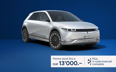 Premio stock (esempio): IONIQ 5 MY2024 Vertex 77.4 kWh 168 kW / 229 PS 2WD, Consumo energetico (in marcia): 17 kWh/100 km, equivalente benzina: 1.87 l/100 km, emissioni di CO2 (in marcia): 0 g/km, emissioni di CO2 dalla produzione di elettricità: 18.7 g/km, categoria di efficienza energetica: B. Prezzo in contanti: CHF 53'900.–, Prezzo di listino: CHF 66'900.– (Premio stock: CHF 13'000.– + Pneumatici invernali completi gratuiti: CHF 2'596.–). Il valore totale dello sconto (Premio stock) dipende dal modello e dal veicolo. Offerta valida dal 03.11.2025 al 17.12.2025 e fino ad esaurimento scorte. Offerte valide solo per clienti privati presso i concessionari aderenti. Tutti gli importi IVA inclusa. Prezzi indicativi non vincolanti, soggetti a modifiche. L'offerta non è cumulabile con il Power Leasing.