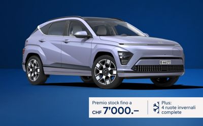Premio stock (esempio): KONA Electric MY2025 Vertex 65.4 kWh 160 kW / 217 PS 2WD, Consumo energetico (in marcia): 14.7 kWh/100 km, equivalente benzina: 1.617 l/100 km, emissioni di CO2 (in marcia): 0 g/km, emissioni di CO2 dalla produzione di elettricità: 16.17 g/km, categoria di efficienza energetica: A. Prezzo in contanti: CHF 47'400.–, Prezzo di listino: CHF 54'400.– (Premio stock: CHF 7'000.– + Pneumatici invernali completi gratuiti: CHF 1'796.–). Il valore totale dello sconto (Premio stock) dipende dal modello e dal veicolo. Offerta valida dal 03.11.2025 al 17.12.2025 e fino ad esaurimento scorte. Offerte valide solo per clienti privati presso i concessionari aderenti. Tutti gli importi IVA inclusa. Prezzi indicativi non vincolanti, soggetti a modifiche. L'offerta non è cumulabile con il Power Leasing.