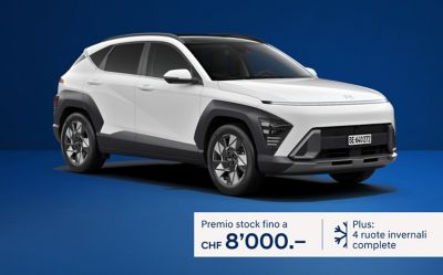 Premio stock (esempio): KONA MY2025 Amplia 1.6 GDi Hybrid 93.8 kW / 129 PS 6 DCT 2WD, Consumo energetico (in marcia): 4.8 kWh/100 km, equivalente benzina: 4.8 l/100 km, emissioni di CO2 (in marcia): 108 g/km, emissioni di CO2 dalla produzione di elettricità: 22.128 g/km, categoria di efficienza energetica: C. Prezzo in contanti: CHF 32'900.–, Prezzo di listino: CHF 40'900.– (Premio stock: CHF 8'000.– + Pneumatici invernali completi gratuiti: CHF 1'796.–). Il valore totale dello sconto (Premio stock) dipende dal modello e dal veicolo. Offerta valida dal 03.11.2025 al 17.12.2025 e fino ad esaurimento scorte. Offerte valide solo per clienti privati presso i concessionari aderenti. Tutti gli importi IVA inclusa. Prezzi indicativi non vincolanti, soggetti a modifiche. L'offerta non è cumulabile con il Power Leasing.