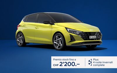Premio stock (esempio): i20 Origo 1.0 T-GDI 66 kW / 90 PS 6 MT, Consumo energetico (in marcia): 5.6 kWh/100 km, equivalente benzina: 5.6 l/100 km, emissioni di CO2 (in marcia): 127 g/km, emissioni di CO2 dalla produzione di elettricità: 25.816 g/km, categoria di efficienza energetica: D. Prezzo in contanti: CHF 21'250.–, Prezzo di listino: CHF 23'500.– (Premio stock: CHF 2'250.– + Pneumatici invernali completi gratuiti: CHF 1'116.–). Il valore totale dello sconto (Premio stock) dipende dal modello e dal veicolo. Offerta valida dal 03.11.2025 al 17.12.2025 e fino ad esaurimento scorte. Offerte valide solo per clienti privati presso i concessionari aderenti. Tutti gli importi IVA inclusa. Prezzi indicativi non vincolanti, soggetti a modifiche. L'offerta non è cumulabile con il Power Leasing.