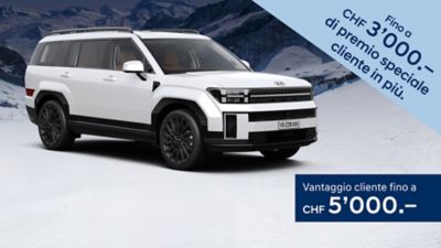 Premio stock (esempio): SANTA FE MY26 Vertex 1.6 T-GDi PHEV 212 kW / 288 PS 6 AT 4WD, consumo energetico (durante la guida): 3.8 l/100 km + 11.4 kWh/100 km, equivalente benzina (totale): 5.1 l/100 km, emissioni di CO₂ (durante la guida): 38 g/km, emissioni di CO₂ dalla produzione di carburante e/o elettricità: 30 g/km, categoria di efficienza energetica: E. Prezzo di listino: CHF 72'700.– (Premio stock: CHF 6'500.– + Swiss Edition: CHF 1'770.–). Il valore totale dello sconto (Premio stock) dipende dal modello e dal veicolo. Offerta valida dal 07.02.2026 al 31.03.2026 e fino ad esaurimento scorte. Offerte valide solo per clienti privati presso i concessionari aderenti. Tutti gli importi IVA inclusa. Prezzi indicativi non vincolanti, soggetti a modifiche. L’offerta è valida esclusivamente per i veicoli in stock. L'offerta non è cumulabile con il Power Leasing.