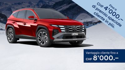 Premio stock (esempio): TUCSON MY26 PHEV Vertex Sunroof Swiss Edition 1.6 T-GDi PHEV 212 kW / 288 PS 6 AT 4WD, consumo energetico (durante la guida): 3.3 l/100 km + 11.2 kWh/100 km, equivalente benzina (totale): 4.5 l/100 km, emissioni di CO₂ (durante la guida): 30 g/km, emissioni di CO₂ dalla produzione di carburante e/o elettricità: 28 g/km, categoria di efficienza energetica: E. Prezzo di listino: CHF 62'400.– (Premio stock: CHF 12'500.– + Swiss Edition: CHF 1'850.–). Il valore totale dello sconto (Premio stock) dipende dal modello e dal veicolo. Offerta valida dal 07.02.2026 al 31.03.2026 e fino ad esaurimento scorte. Offerte valide solo per clienti privati presso i concessionari aderenti. Tutti gli importi IVA inclusa. Prezzi indicativi non vincolanti, soggetti a modifiche. L’offerta è valida esclusivamente per i veicoli in stock. L'offerta non è cumulabile con il Power Leasing.