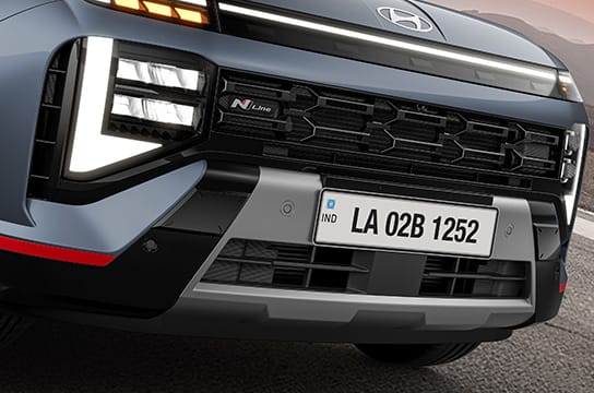 The all-new Hyundai VENUE N Line wears its attitude on the outside. Every element is crafted to turn motion into a statement, from the LED turn signal with sequential function that announce your every move with flair, to the bold N Line grille, skid plate and wing type spoiler that add a distinct edge. R17 (D=436.6 mm) diamond cut alloys with N emblem and red calipers showcase performance even at a standstill. The red accents on the roof rails underline its N Line identity. Every curve every cut speaks the language of pure sportiness.