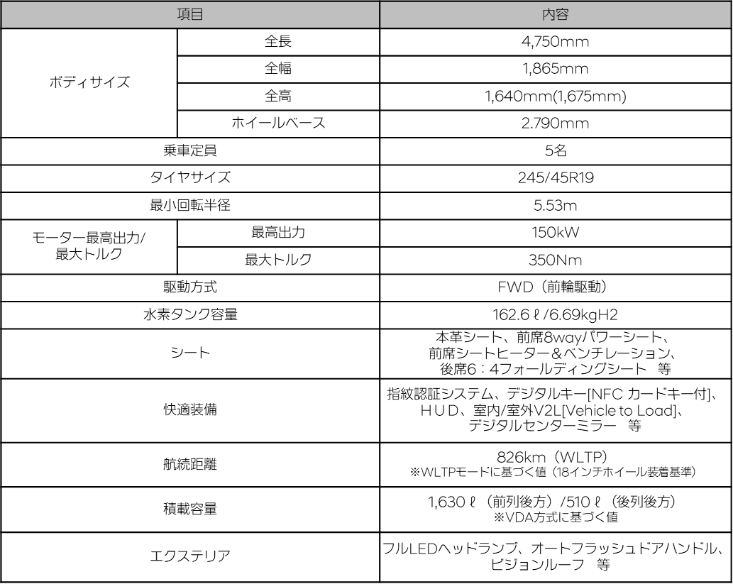 水素燃料電池スタック(FCスタック)の最高総出力は従来比16%増の110kW、新型電気モーターは最大150kWの出力を発揮。さらに、水素タンク容量は先代モデルの6.33kgから6.69kgへと増加し、燃料貯蔵密度の向上とともに充填頻度の低減を両立。航続距離は、WLTP基準で最大826kmを達成し、日常使いから長距離移動まで、より自由で快適なモビリティ体験を提供します。