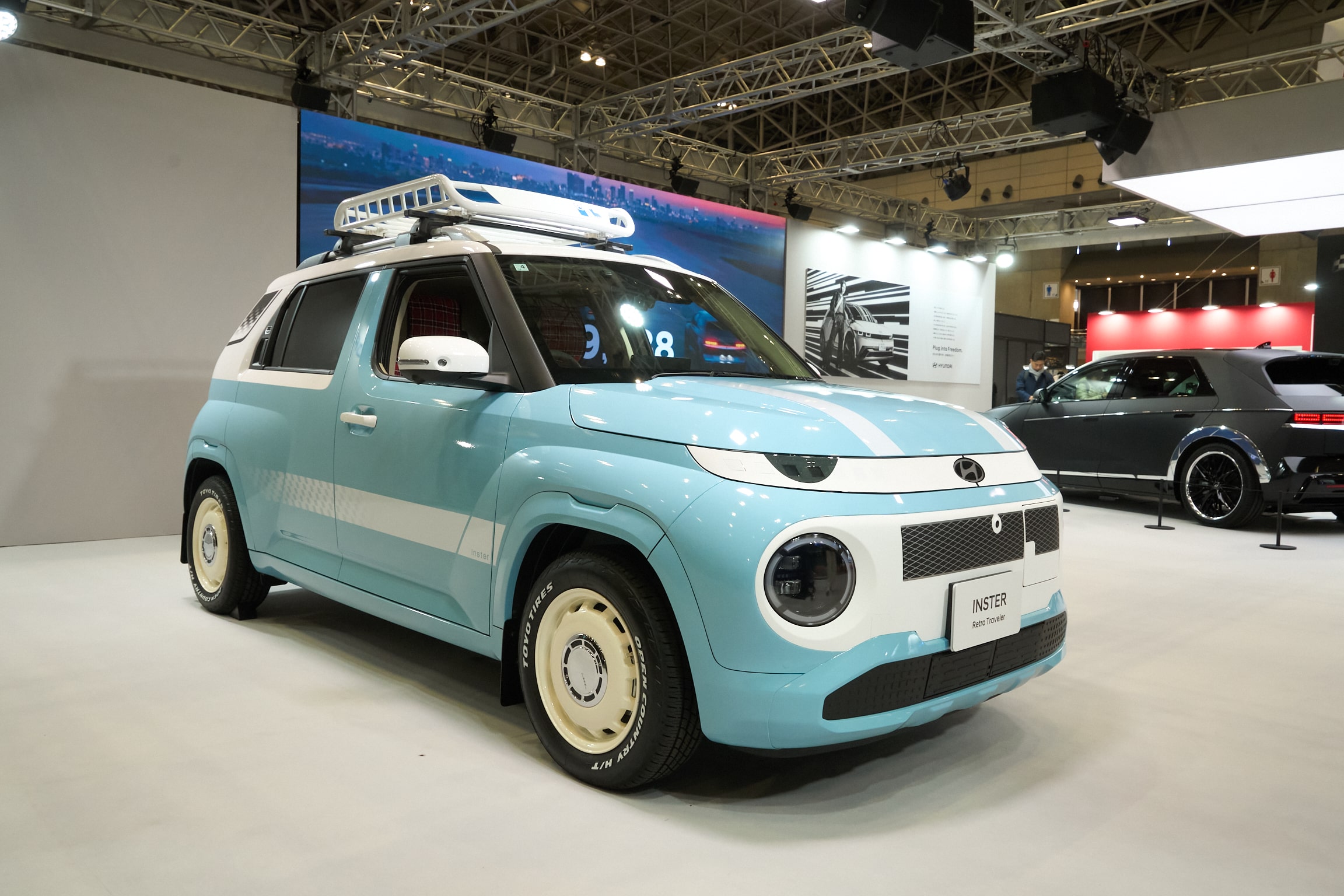 「Plug into Freedom.(プラグ イントゥ― フリーダム)」、お客様にワクワクしてもらえるコンセプトカーをご用意しています。こちらに展示している INSTER のカスタムカーもその一つ。どこか懐かしくて、気軽に自由に出かけたくなる――そんな「レトロ・トラベラー」をテーマに、走る楽しさを素直に形にした一台です。どうぞ、お近くで感じていただければと思います。