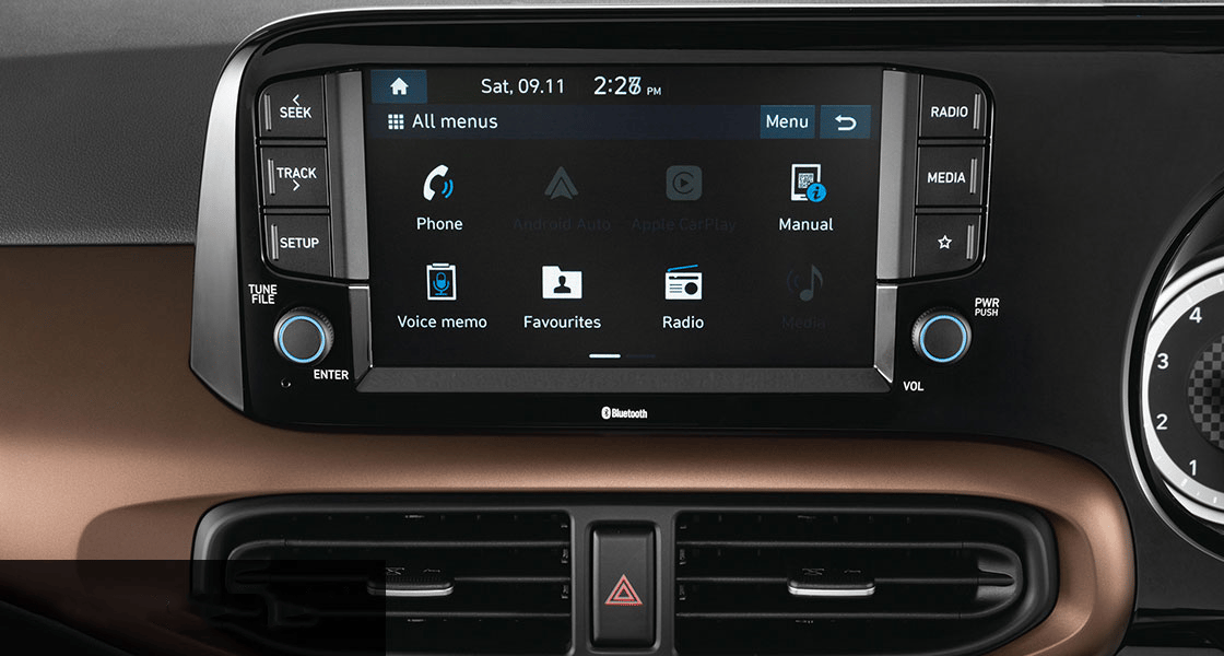 Le système infotainment de 20,25 cm (8") avec connectivité smartphone du Grand i10 Sedan offre une expérience numérique fluide, vous permettant d'accéder facilement à vos applications et contenus préférés en toute simplicité.