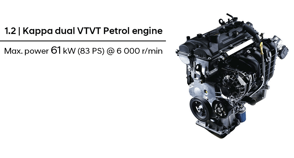 Le moteur 1.2 Kappa Dual VTVT offre une puissance maximale de 61 kW (83 ch) à 6 000 tr/min et un couple maximal de 113,8 Nm (11,6 kgm) à 4 000 tr/min, garantissant des performances remarquables et une conduite fluide.