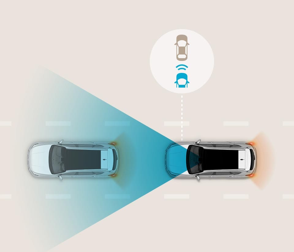 Reflexive radar sensors in the rear bumper warn the driver of approaching vehicles that aren’t visible.